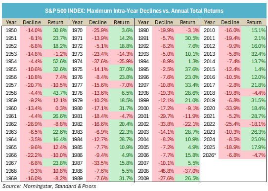 While the daily events surrounding Iran and the Hormuz Strait take up most of the headlines, we are patiently using market dips to put excess cash to work for our clients. Market corrections are a natural part of investing (you have to take on some risk if you want the return) and we just saw a modest drawdown in March. The chart below demonstrates that every year the S&P index sees some intra-year decline and it rebounds the majority of the time.