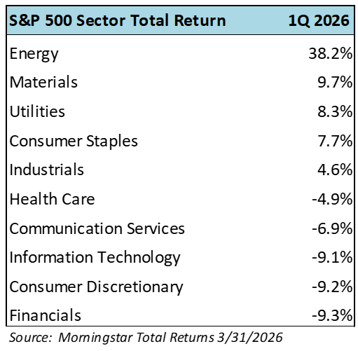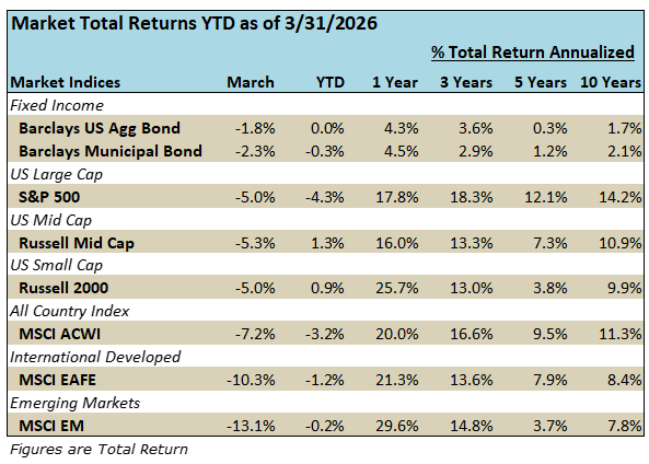 As the table above illustrates, March was a down month with not many places to hide. Even “safe haven” gold fell 11% during the month. U.S. indexes performed better than international counterparts due to our net energy exporting status. The bell-weather S&P 500 index fell 5% in March and posted a modest 4.3% decline for the year-to-date ending 3/31/26.