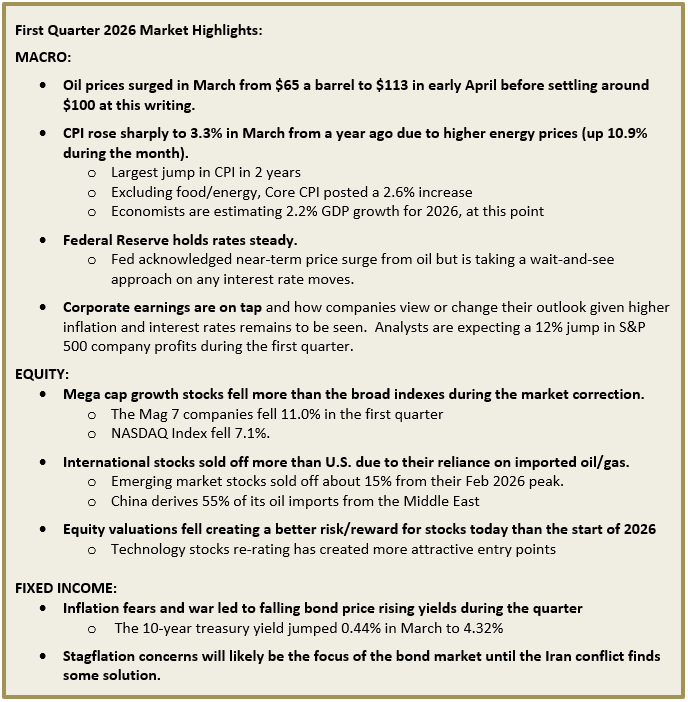 The first quarter was mostly defined by the month-long invasion of Iran by the U.S. after failed diplomatic talks. Volatility reigned supreme. Oil prices rose sharply as Iran closed the Strait of Hormuz to tanker traffic thereby creating a supply chokehold. Equities around the globe sold off in March with most indexes falling into correction territory (down by 10% or more from recent peaks). The last day of the quarter saw a sharp stock and bond rally in hopes of war de-escalation. We believe we are still in a period of heightened volatility.