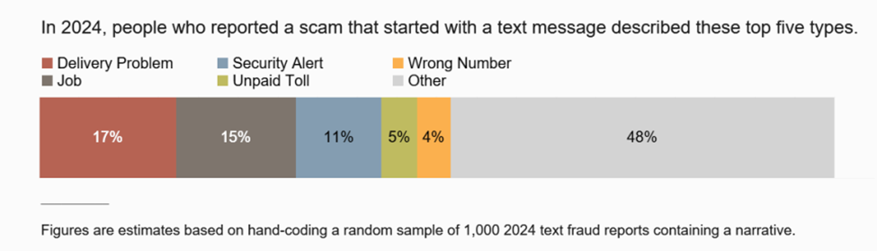 The FTC estimates that about half of all text fraud falls into these five categories: