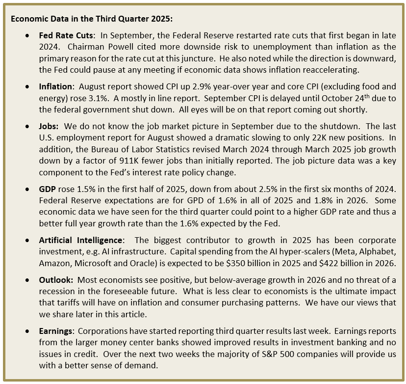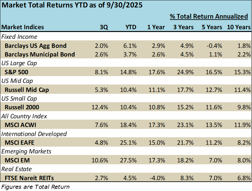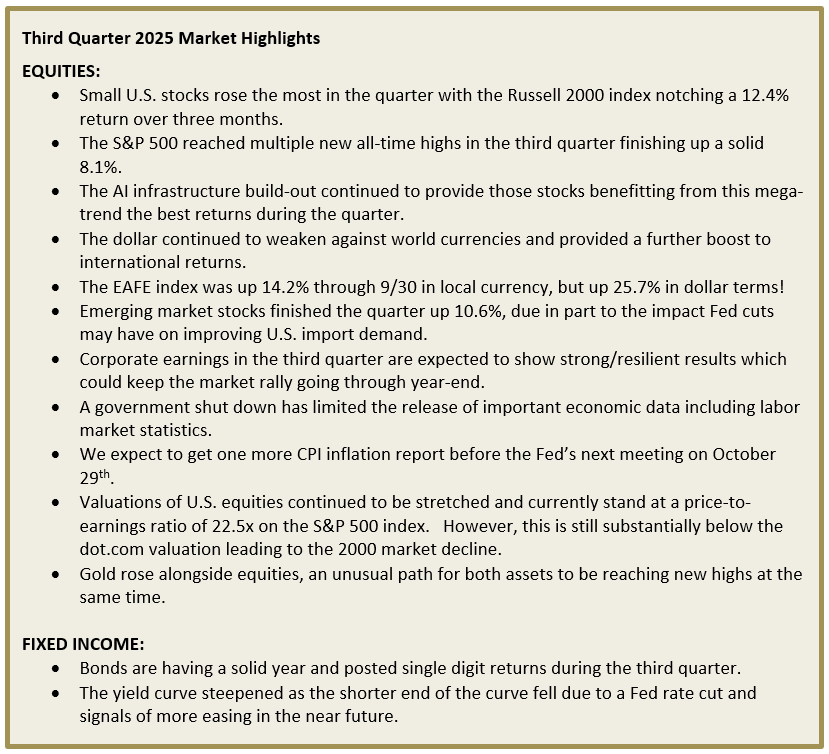 Financial markets continued their upward momentum in the third quarter as tariff worries eased, and the Federal Reserve cut interest rates and signaled more to come. The S&P 500 index is up 35% from April lows and markets show no sign of fatigue as we enter the last quarter of the year.