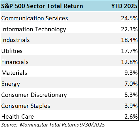 We continue to be in an AI infrastructure-led market, but there is market breadth outside of this important growth trend. Other economic sectors such as financial, industrials and utilities have returned double-digits year-to-date. Between the benefits of AI productivity already in use and the dovish Fed, we see a positive outlook for stocks and bonds for the next 6-12 months.