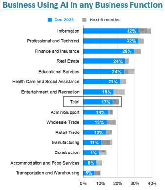 We highlight a chart by J.P. Morgan showing what portion of business sectors are using AI today and will likely use it in the next six months. JP Morgan estimates that AI penetration is low at just 17%.