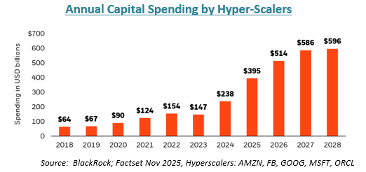 We are once again constructive on equities. The AI-related capital spending and investment mega-cycle has been the top driver of growth over the last two years, and we think that remains the case in 2026 as well. We expect infrastructure spending will continue to growth over the next few years as hyper-scalers have already offered up their forecasts (see chart below).
