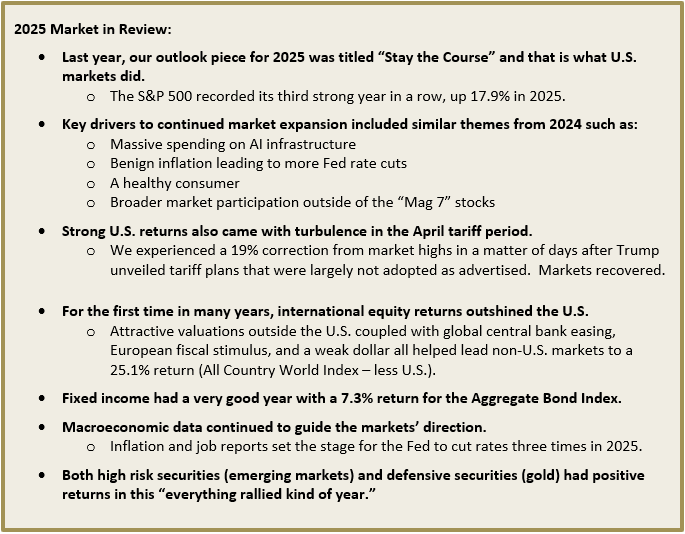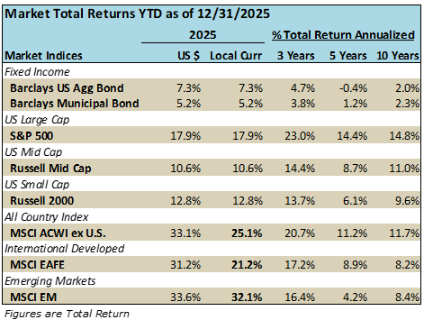 YEAR IN REVIEW: Year 2025 brought above average returns around the globe in both stock and bond markets as economic growth held up well despite uncertainties around tariffs and other geopolitical conflicts. Many economists initially lowered growth expectations after the April tariff announcments, but back-tracked when the reality was much less than was advertised. Additionally, improved growth in Europe and China helped lift many economies that has been stagnating prior to 2025.