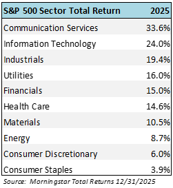Year 2025 brought more diversified returns as multiple sectors posted double digit gains. While the strongest area continued to be technology (communication services up 33.6% and information technology up 24.0%), other sectors like industrials, utilities, financials, health care, and materials all enjoyed gains over 10% during the year (see table below).