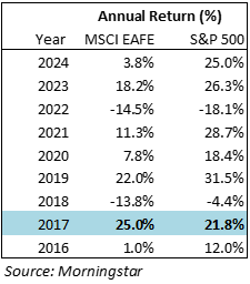 It was the first time in years that international stocks posted better positive returns than the U.S. Not since 2017 has the broad international index (MSCI EAFE) positively outperformed the S&P 500 (see table below).
