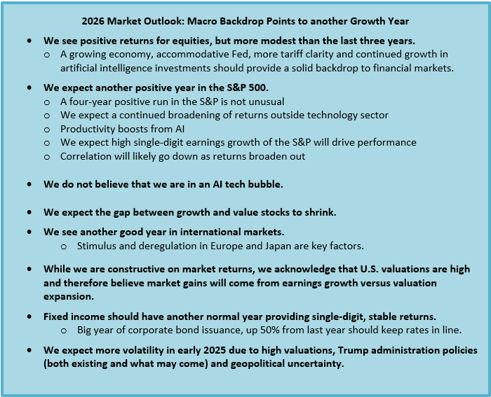 We also expect more volatility given market valuations. Unexpected events could create gyrations during the year, much like the tariff announcement did in 2025.