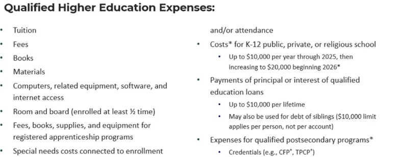 However, we recommend setting aside funds in a 529 account first. The $5,000 contribution limit is likely not going to cover expenses for a high-level college and there is no tax break on the earnings since it will come out as ordinary income. Compared to a 529 where earnings grow tax deferred and are tax free for qualified education withdrawals. There are also no contribution limits until the account hits the state’s maximum account balance, typically around $500,000. Another unique feature is the ability to superfund 5 years’ worth of the annual gift tax exclusion in one year. 529’s also allow the ability to change the beneficiary to eligible family members if the funds are not being used. They continue to expand what is included as a qualified expense including postsecondary designations and increasing the limit from $10,000 to $20,000 for K-12 expenses.